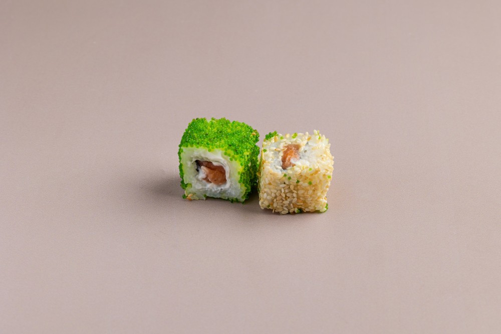 Рис, сыр плавленый виола, лосось с/м, икра летучей рыбы, кунжут