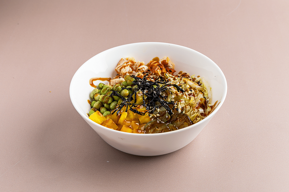 Рис, пекинская капуста, перец халапенью, редька, горошек консервированный, грудка копченная, соус барбекю, кунжут, нори