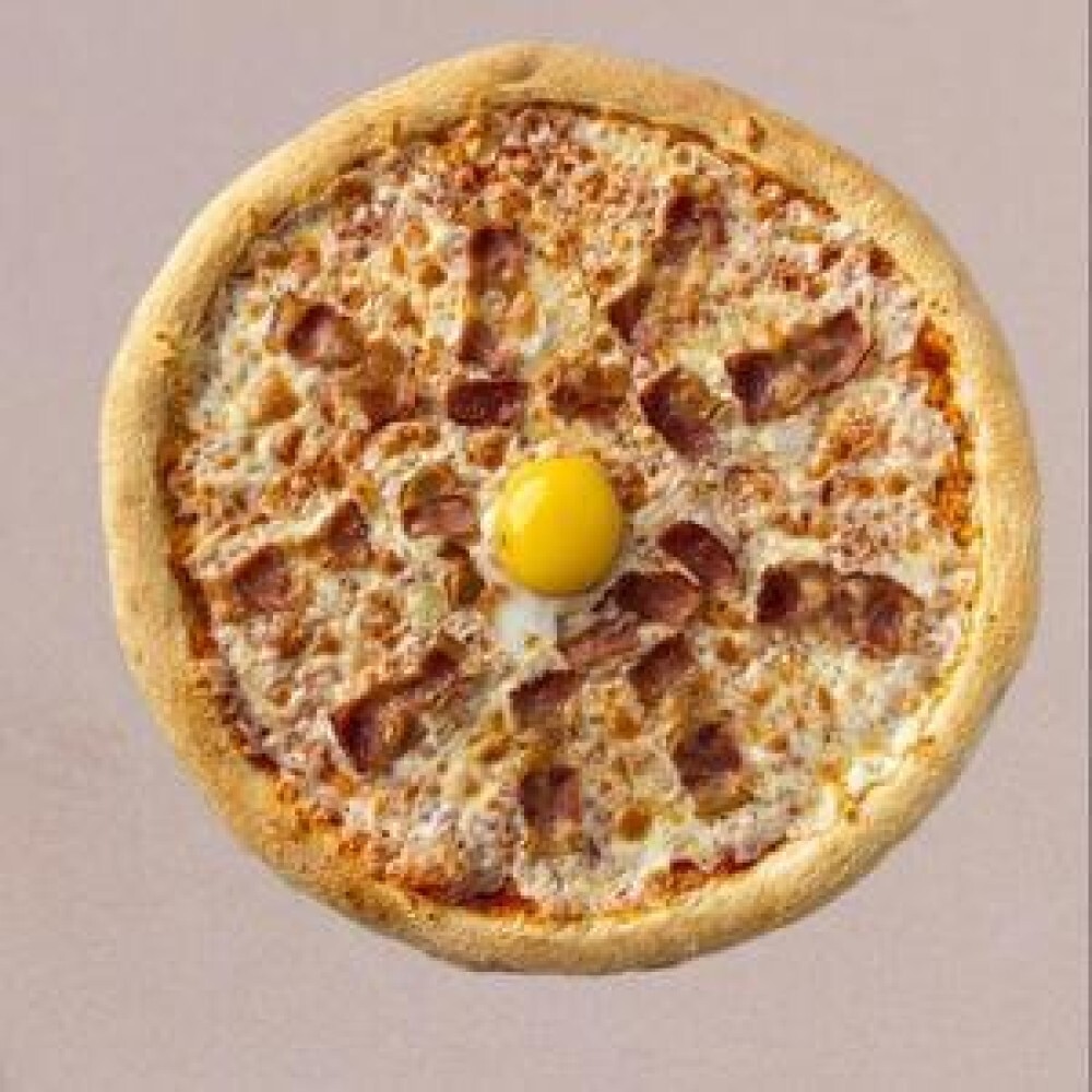 Соус мутти, бекон, сыр моцарелла, маслины, лук репчатый, яйцо