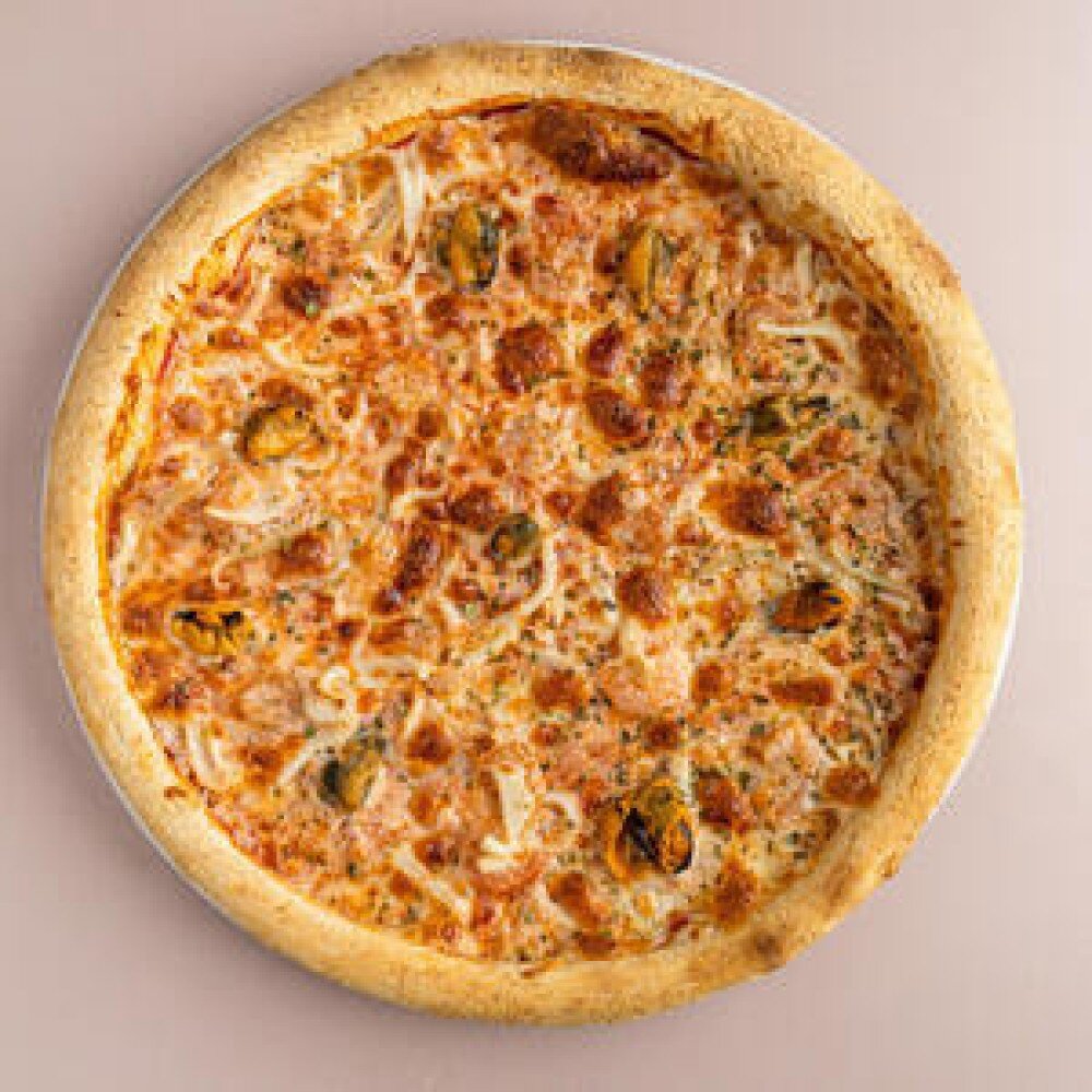 Соус мутти, кальмары отварные, креветки отварные, мидии отварные, сыр моцарелла, зелень