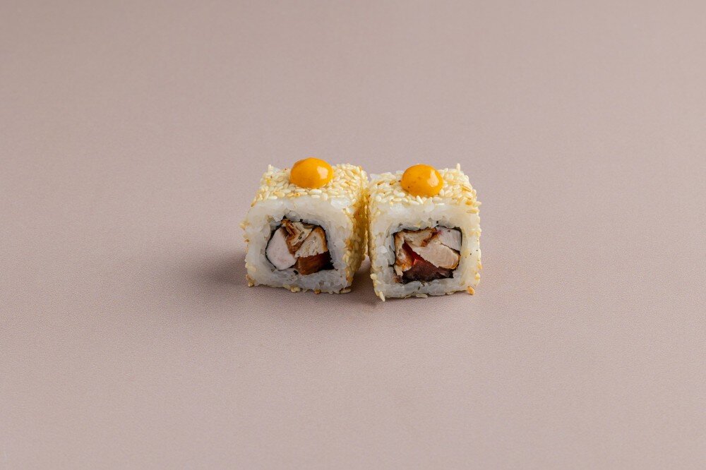 Рис, соус спайс, кунжут, помидор, томаго, копченое филе цыпленка