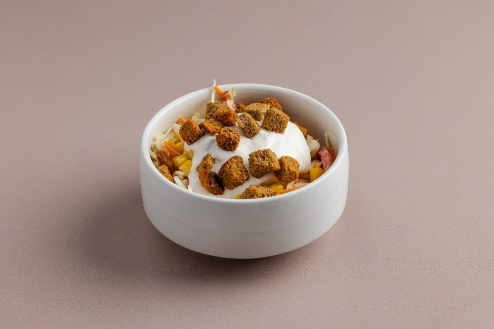 Капуста, морковь, колбаса п/к, сыр подкопченный, кукуруза, кириешки, соус сметано-чесночный