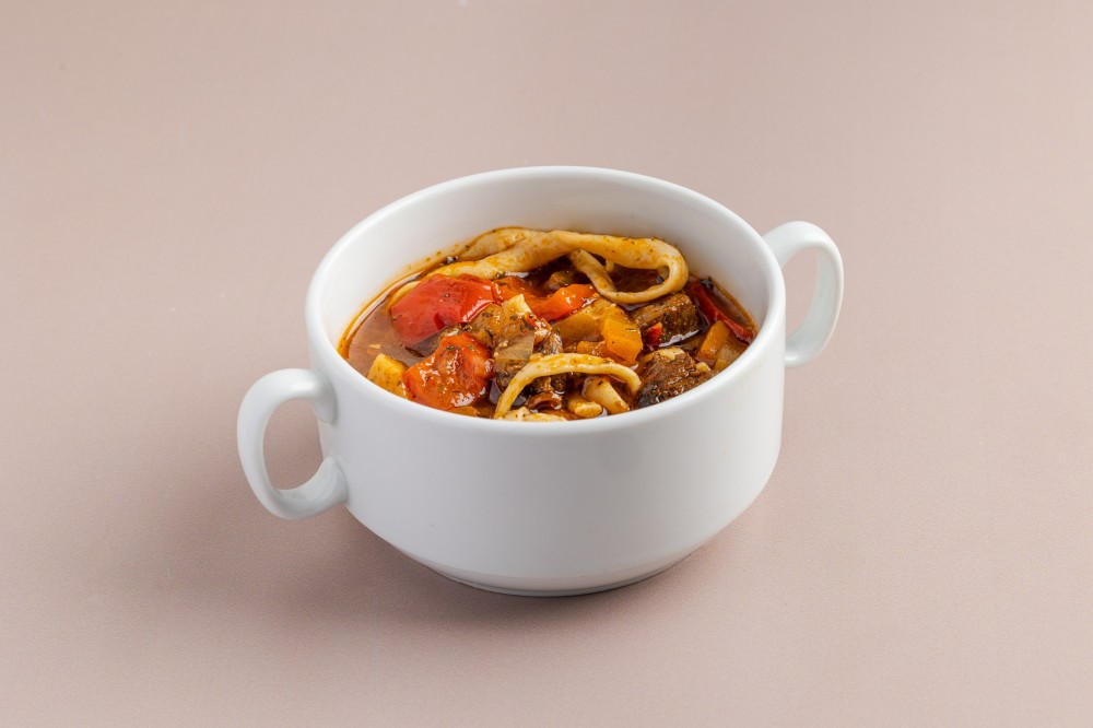 Говядина, картофель, спагетти, лук, морковь, редька, перец болгарский, томатная паста, чеснок, специи, зелень