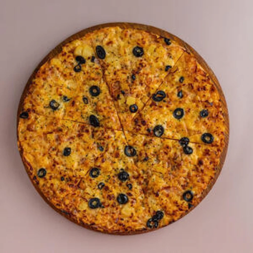 Ветчина, ананас консервированный, соус, сыр, маслины, зелень