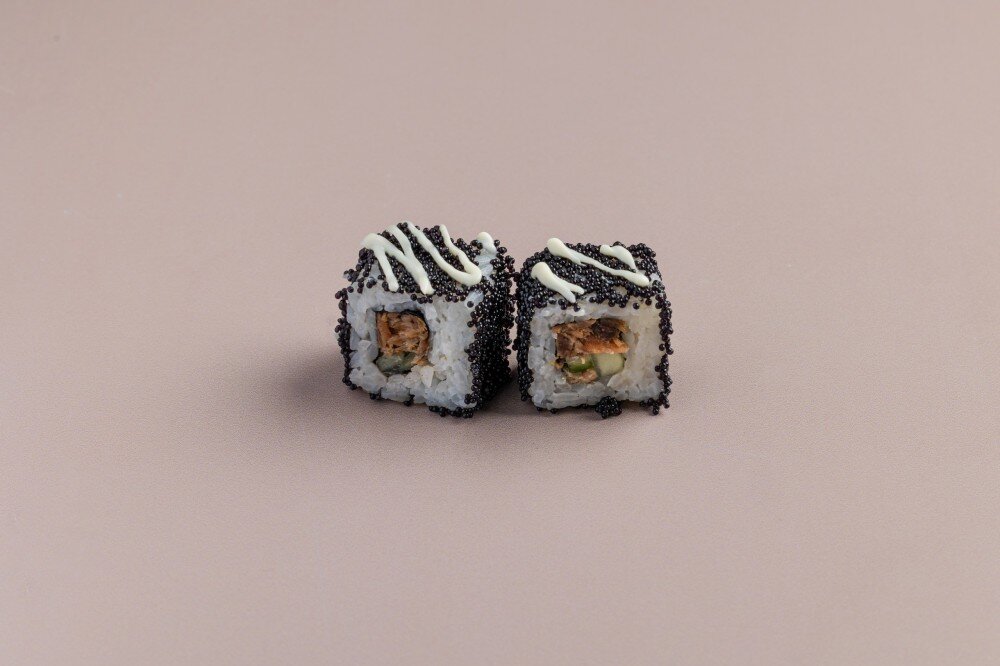 Жареная кожа лосося, огурец, икра тобико, соус сливочный