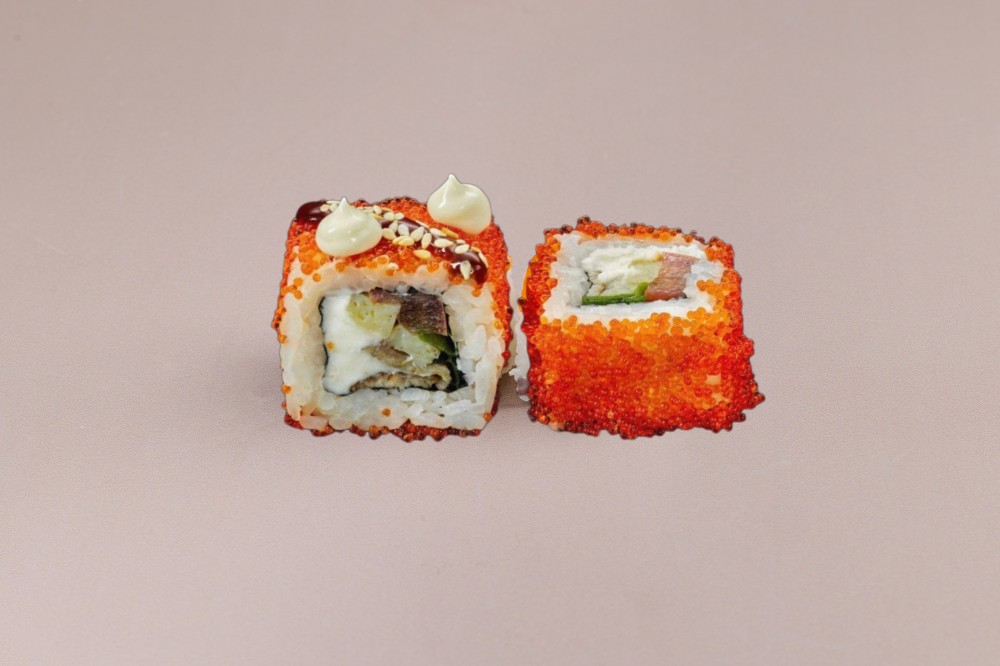 Томаго, зелёный лук, помидор, угорь, творожный сыр, икра тобико, майонез, кунжут, соус унаги, рис, нори