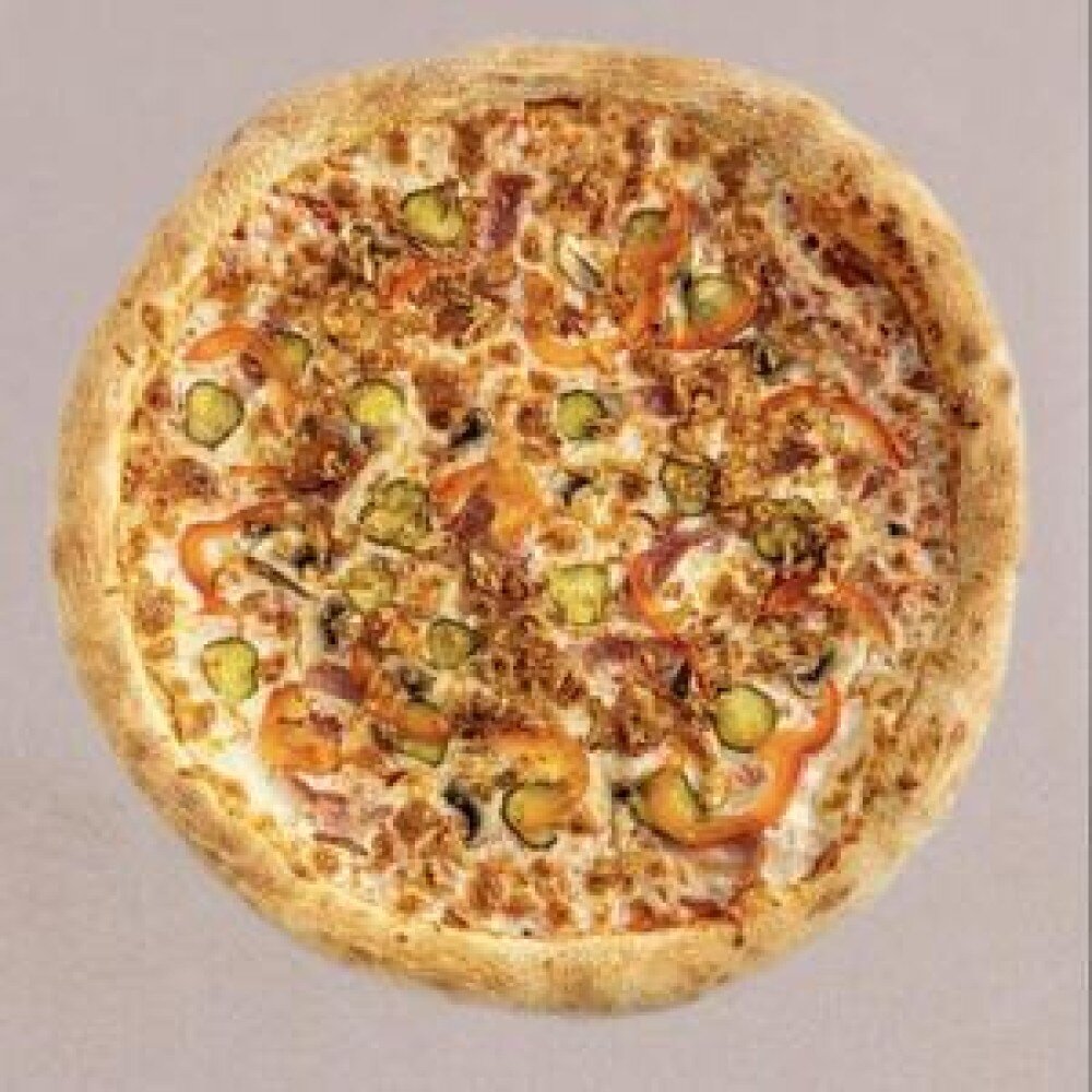 Ветчина, бекон, шампиньоны, огурец маринованный, перец болгарский, лук криспи, моцарелла, соус мутти