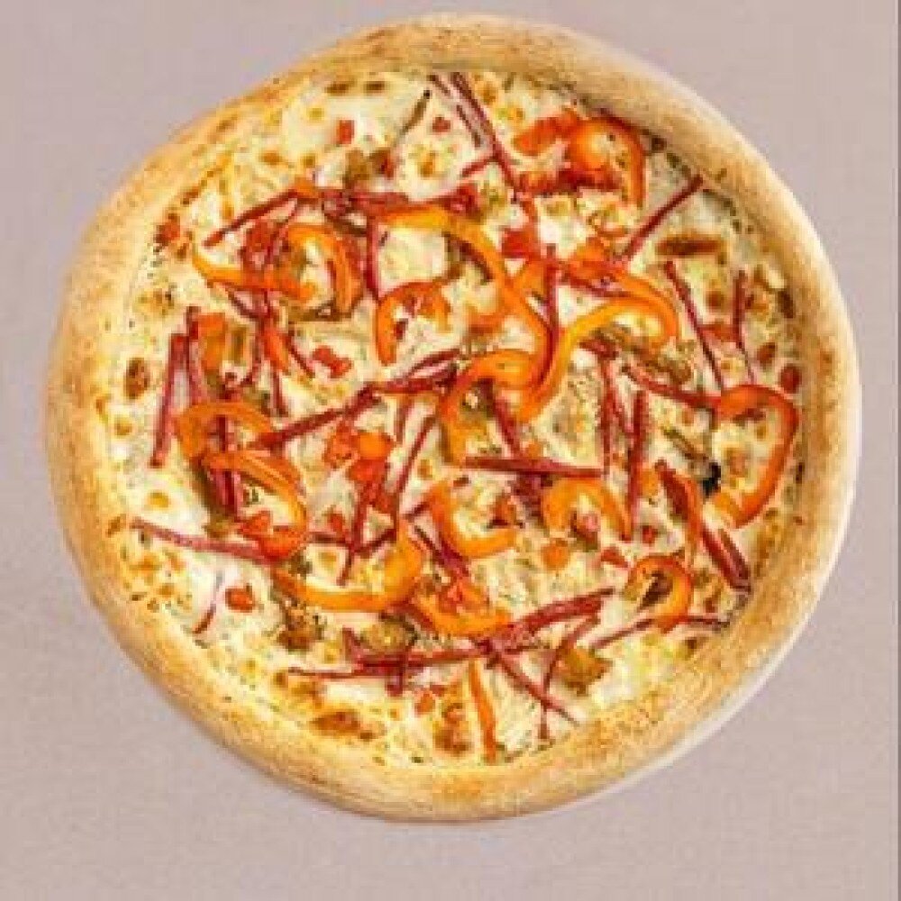 Филе куриное, колбаса полукопченая, помидор, грибы жареные с луком, перец болгарский, соус чесночный, моцарелла