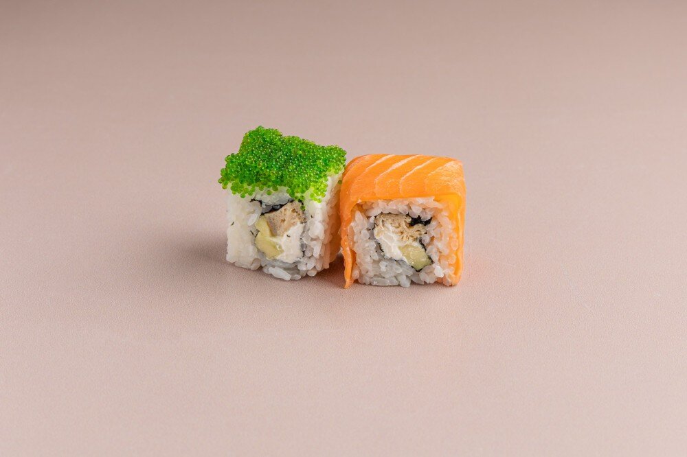 Рис, лосось х/к, авокадо, сыр буко, омлет японский, икра летучей рыбы