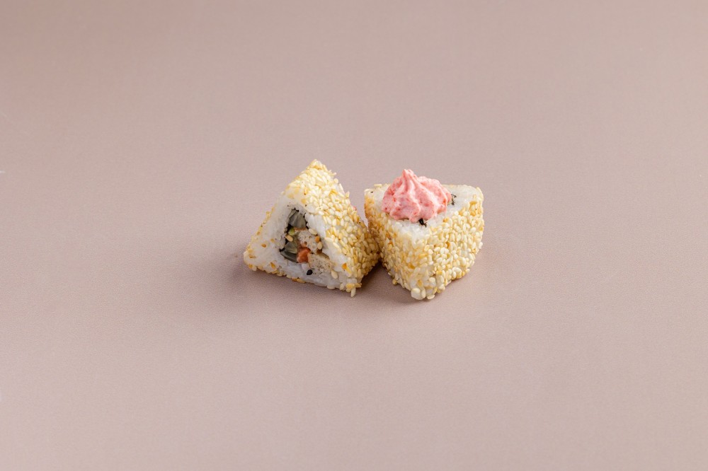 Рис, свежий огурец, лосось х/к, японский омлет, кунжут, соус лава
