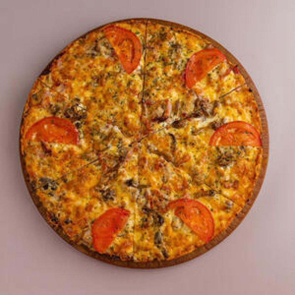 Филе куриное маринованное, бекон, помидоры, два вида сыра, опята, майонез, зелень