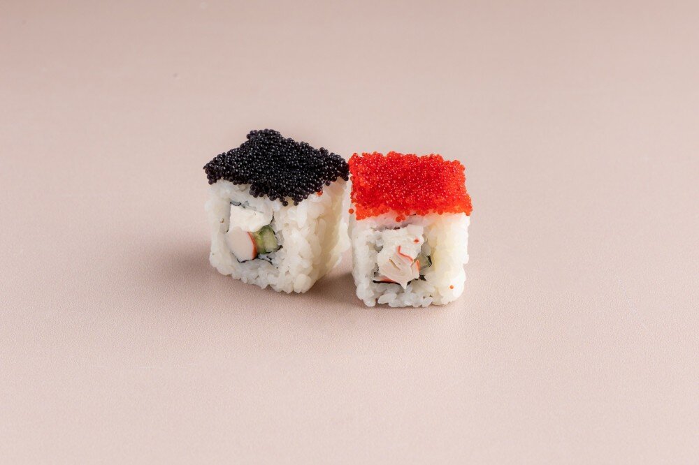 Рис, икра летучей рыбы, свежий огурец, крабовые палочки, сыр творожный
