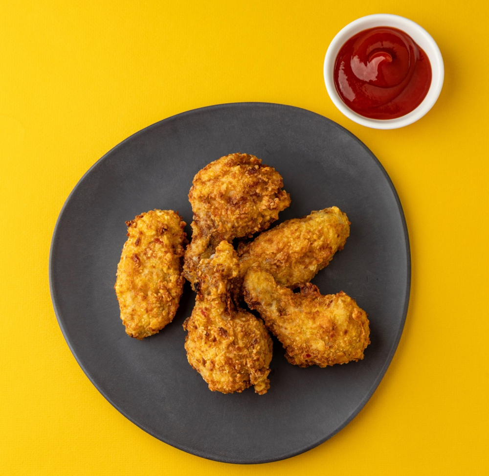 Маринованные куриные крылья в острой панировке, обжаренные во фритюре. Соус на выбор включен.