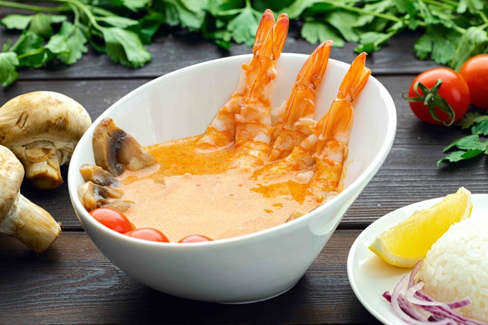 Свежие шампиньоны, помидоры черри, креветка, лемонграсс, кафир-лайм, чили, кокосовое молоко, рыбный соус, лук, галангал, томаринд, рис микс, лимон, петрушка, красный лук