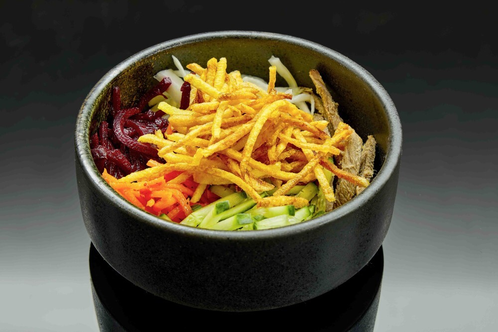 Говядина отварная, морковь по-корейски, маринованные свёкла и капуста, огурец, картофель пай, заправка: масло/майонез на выбор