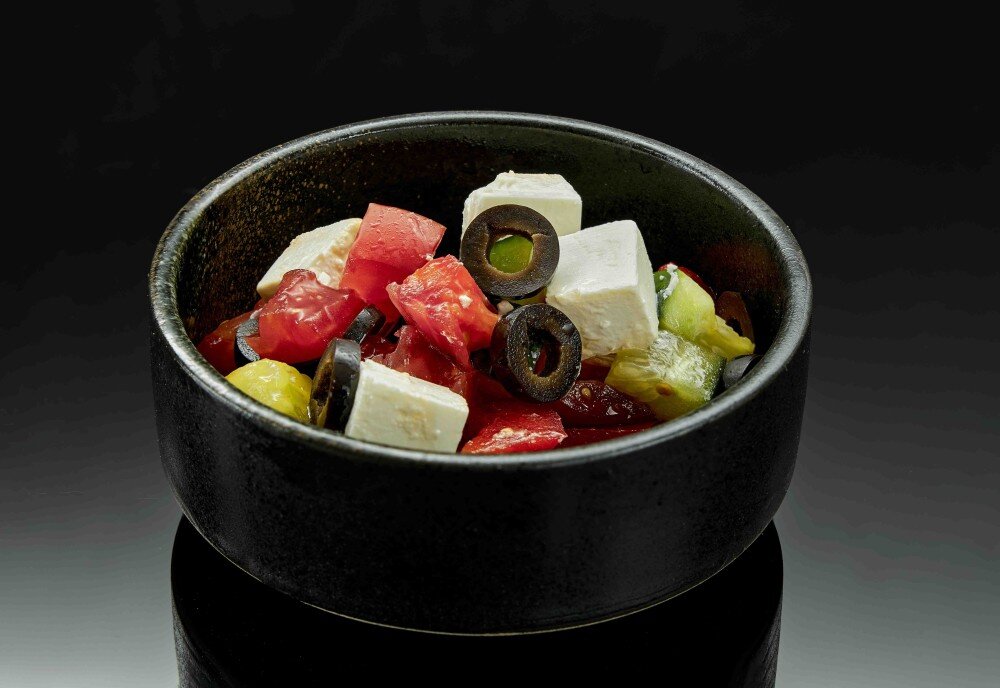 Помидор, огурец, болгарский перец, маслины, сыр брынза, соевый соус, растительное масло