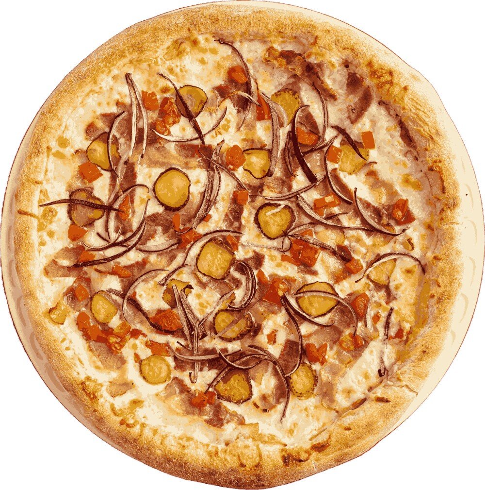 Итальянское тесто, соус Бургер, бекон, конс. огурцы, помидор, красный лук, моцарелла.
