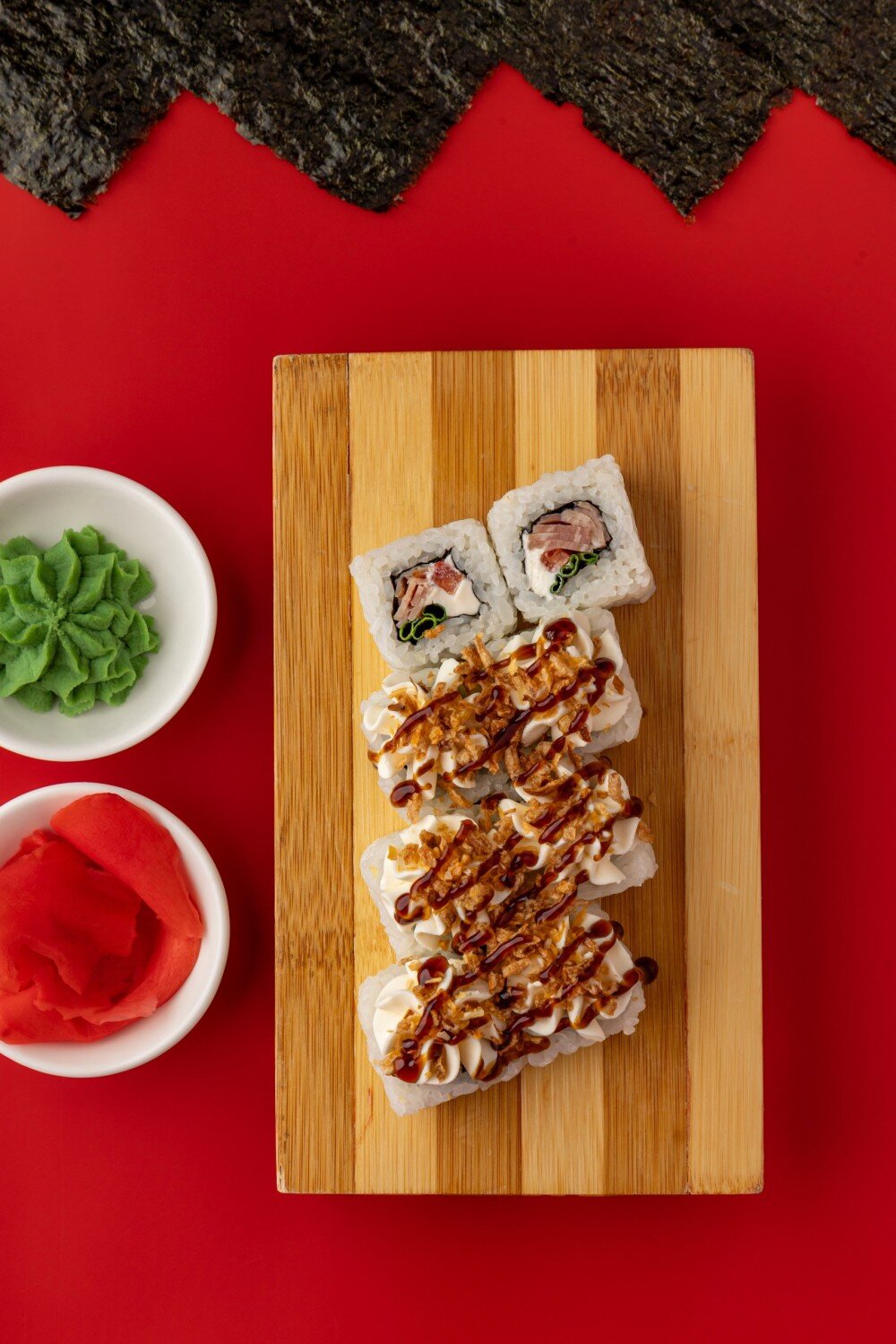 Бекон, помидор, сыр творожный, лук зеленый, соус Унаги, лук Криспи.