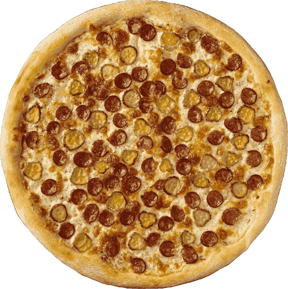 Итальянское тесто, охотничьи колбаски, огурцы консервированные, сыр моцарелла, соус 7 LiR, зелень