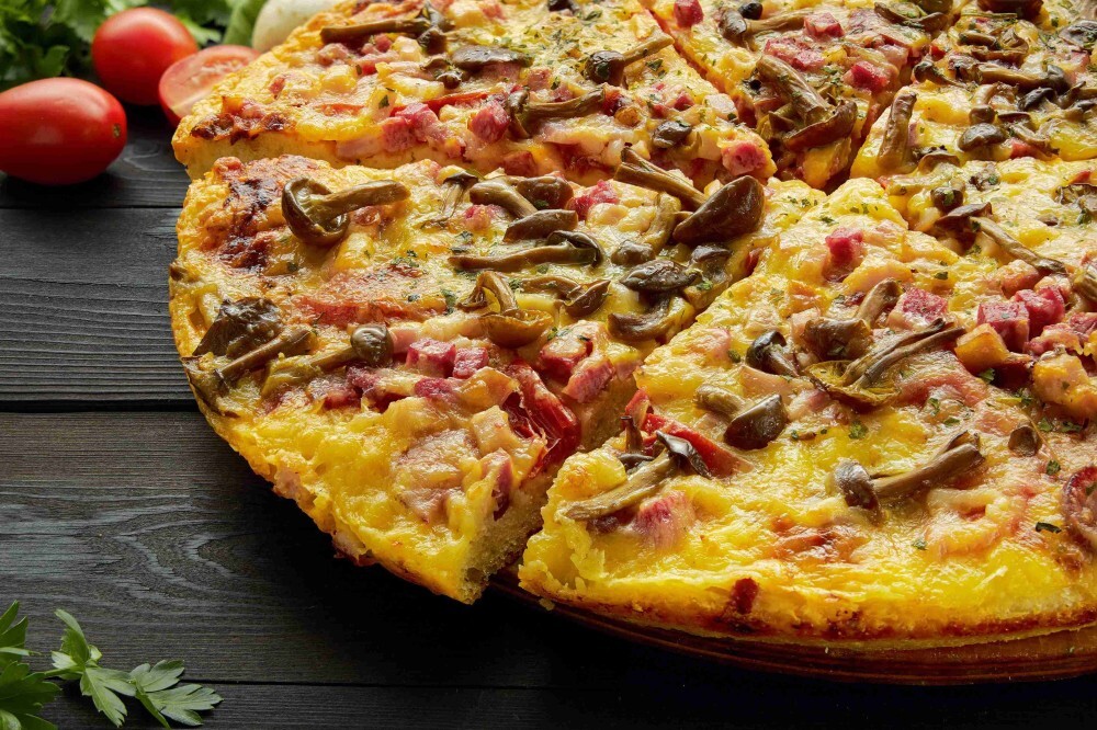 Колбаса п/к, ветчина, бекон, охотничьи колбаски, помидор, опята, сыр, соус, лук репчатый, зелень