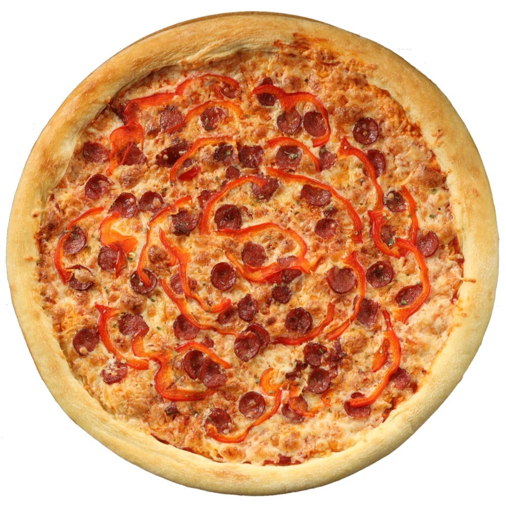 Итальянское тесто, томатный острый соус, охотничьи колбаски, перец болгарский, сыр Моцарелла, орегано