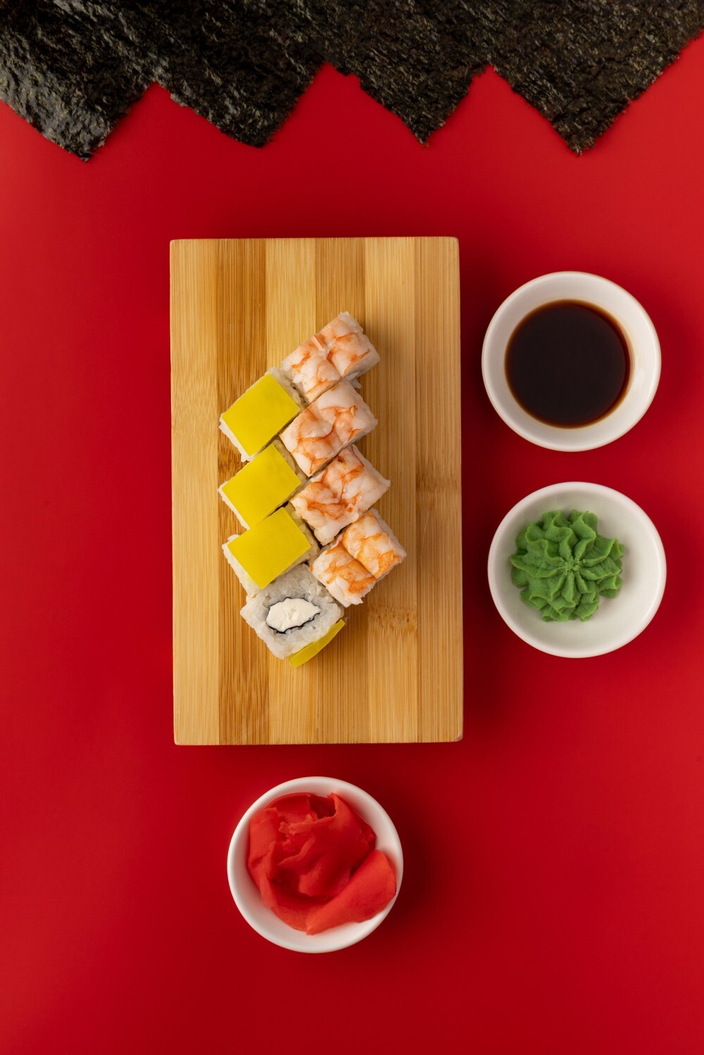 Креветка отварная, сыр творожный, дайкон маринованный, соус Бэнг-бэнг.