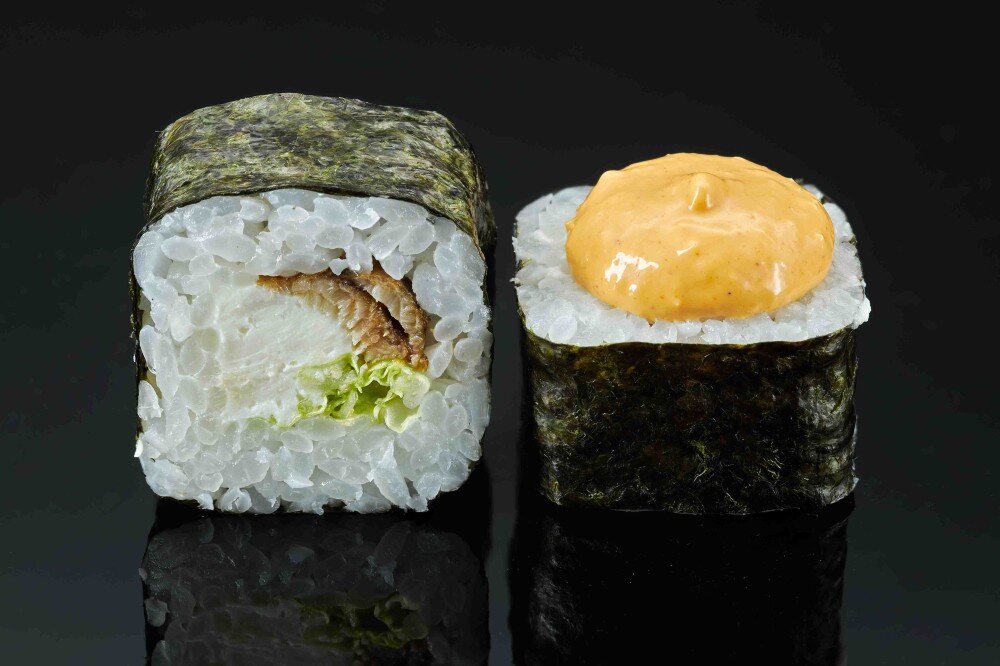 Рис, нори, угорь, сыр творожный, капуста пекинская, соус Спайс