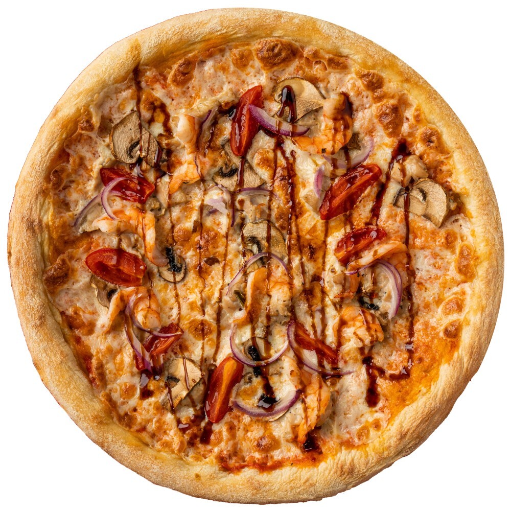 Итальянское тесто, креветки, маринованное куриное филе, помидоры черри, шампиньоны, красный лук, сыр моцарелла, соус Унаги