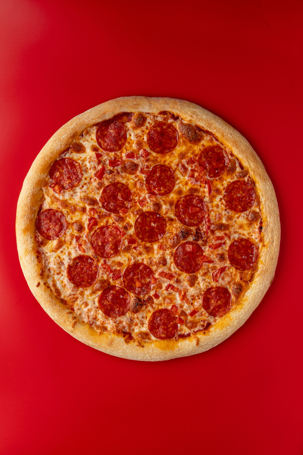 Соус томатный, колбаски пепперони, помидор свежий, сыр моцарелла, орегано.