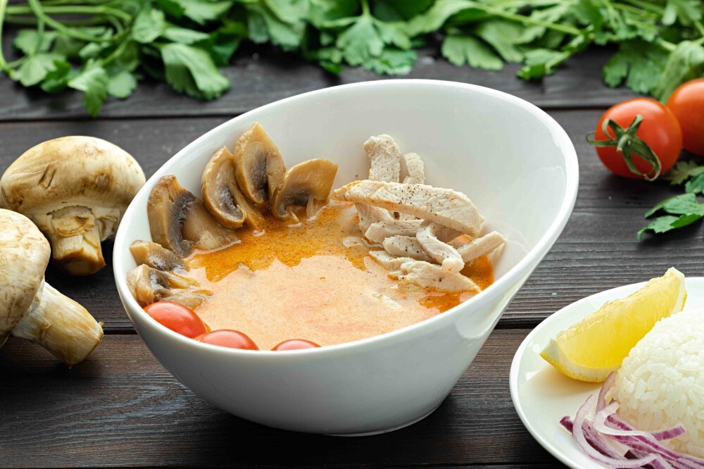 Свежие шампиньоны, помидоры черри, лемонграсс, кафир-лайм, чили, кокосовое молоко, рыбный соус, куриное филе отварное, рис микс, лимон, лук красный, петрушка свежая