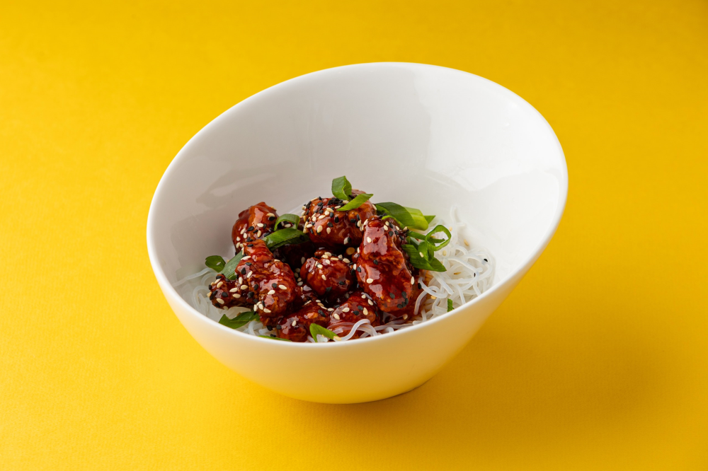 Куриное филе в нежном кляре, рис, соус Сеульский с арахисом, зеленый лук, кунжут (по желанию). Гарнир на выбор: японский рис или фунчоза.