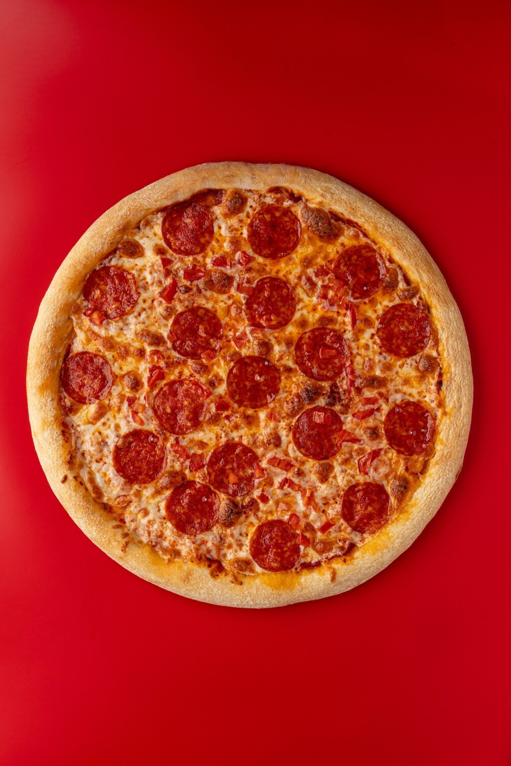 Соус томатный, колбаски пепперони, помидор свежий, сыр моцарелла, орегано.
