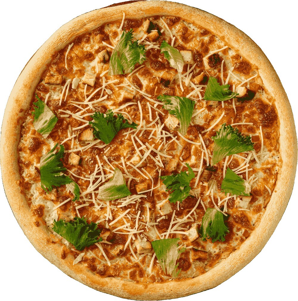 Итальянское тесто, филе куриное копченое, лист салата, помидор свежий, сыр пармезан, сыр моцарелла, соус "Цезарь"