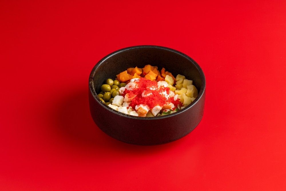 Креветка отварная, картофель отв., морковь отв., яйцо отв., огурец свежий, горошек конс., икра Масаго, майонез