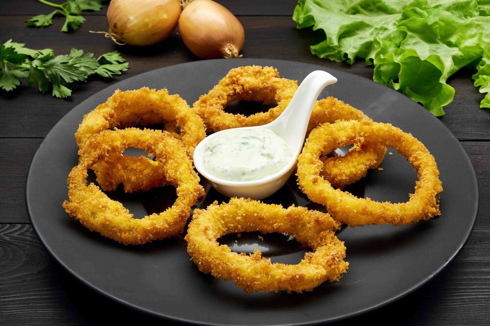 Луковые кольца в панировке, жаренные во фритюре, подаются с чесночным соусом