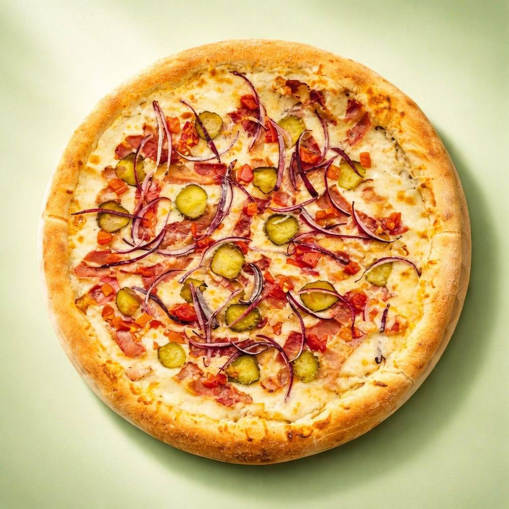 Итальянское тесто, соус Бургер, бекон, конс. огурцы, помидор, красный лук, моцарелла.