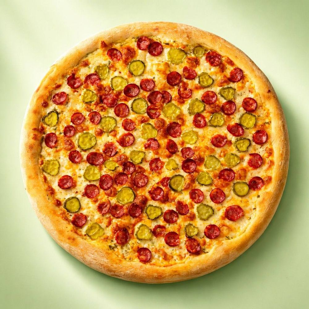 Итальянское тесто, охотничьи колбаски, огурцы консервированные, сыр моцарелла, соус 7 LiR, зелень