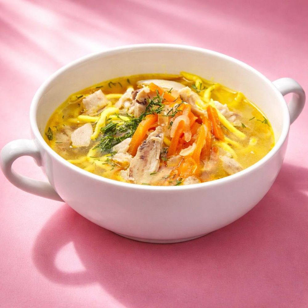 Филе куриное, лук, морковь, лапша домашняя (яйцо, мука), укроп свежий, специи