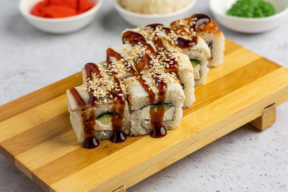 Рис, нори, угорь, огурец, сыр творожный, кунжут