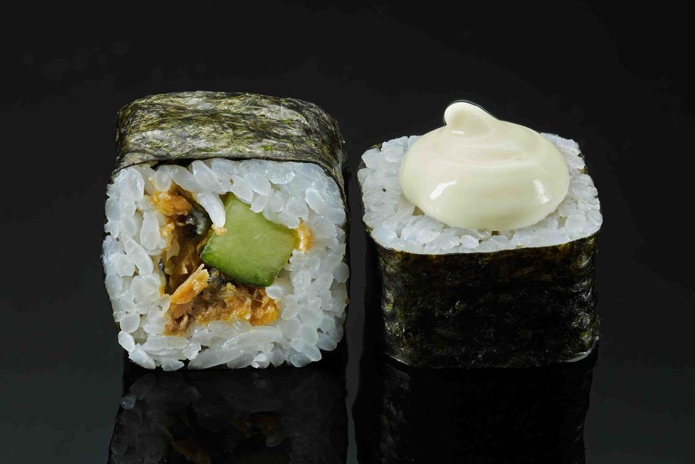 Рис, нори, огурец, жареная кожа лосося, соус сливочный