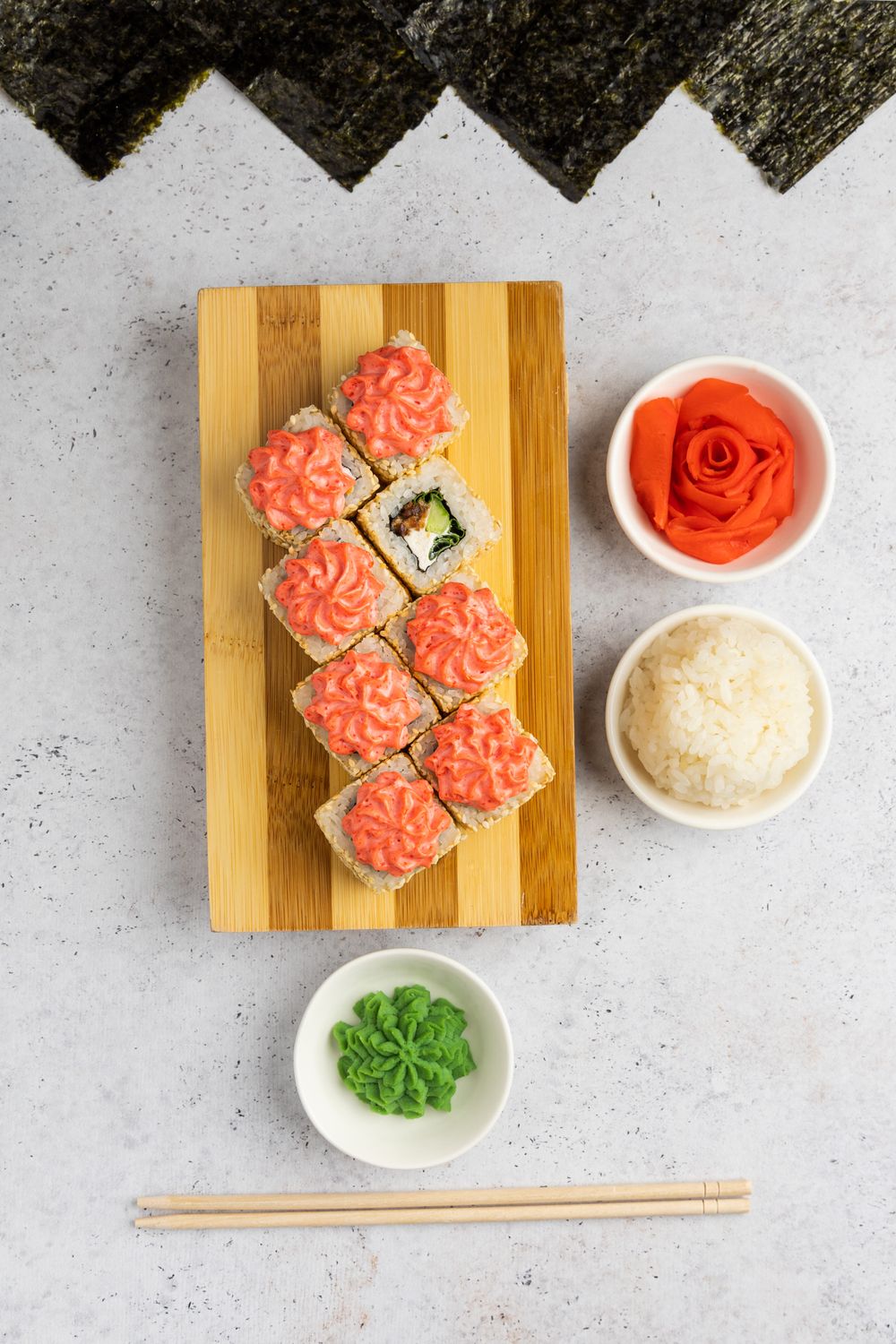 Рис, нори, сыр творожный, жареная кожа лосося, зеленый лук, огурец, кунжут, соус Лава