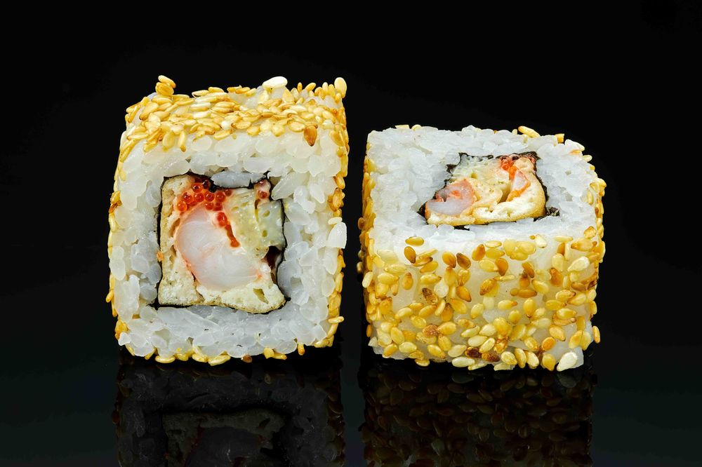 Рис, нори, креветка тигровая в кляре, икра летучей рыбы, японский омлет, кунжут, майонез
