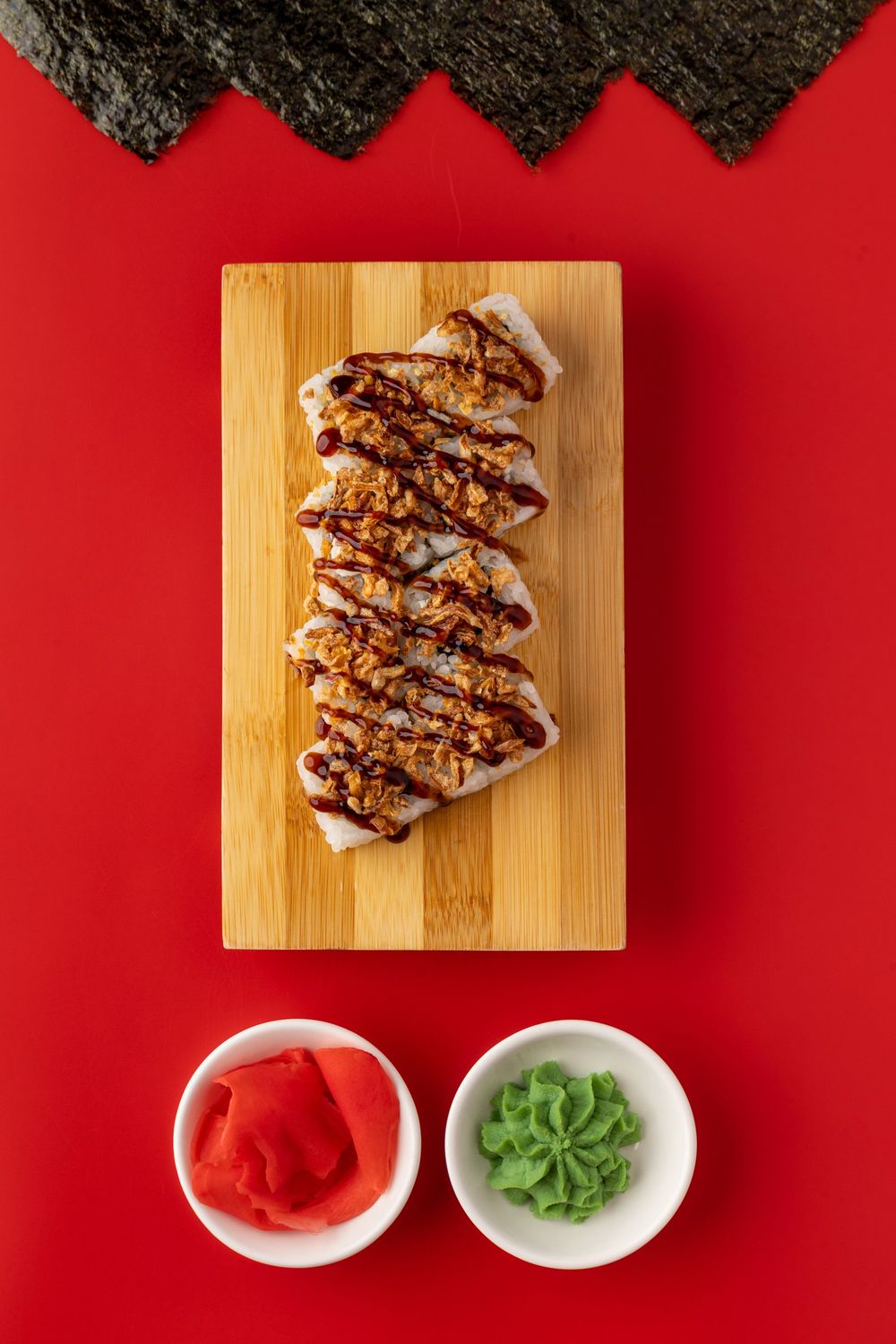 Филе копченого цыпленка, помидор, сыр творожный, лук Криспи, соус Унаги.