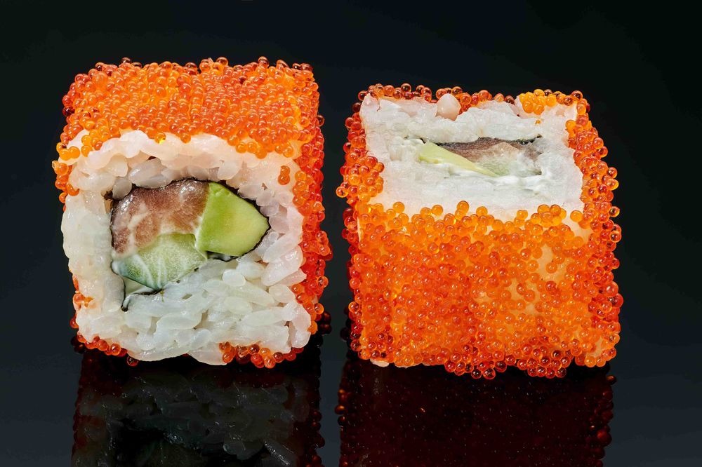Рис, нори, лосось с/м, авокадо, огурец, икра тобико, майонез