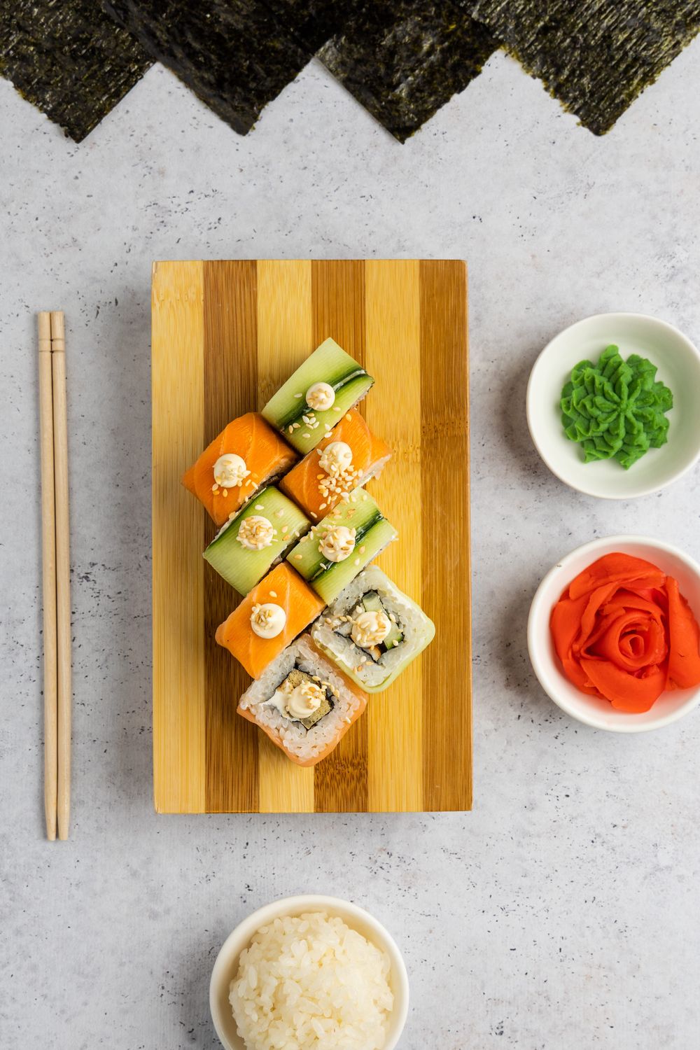 Рис, нори, лосось с/м, угорь, сыр творожный, огурец, майонез, томаго