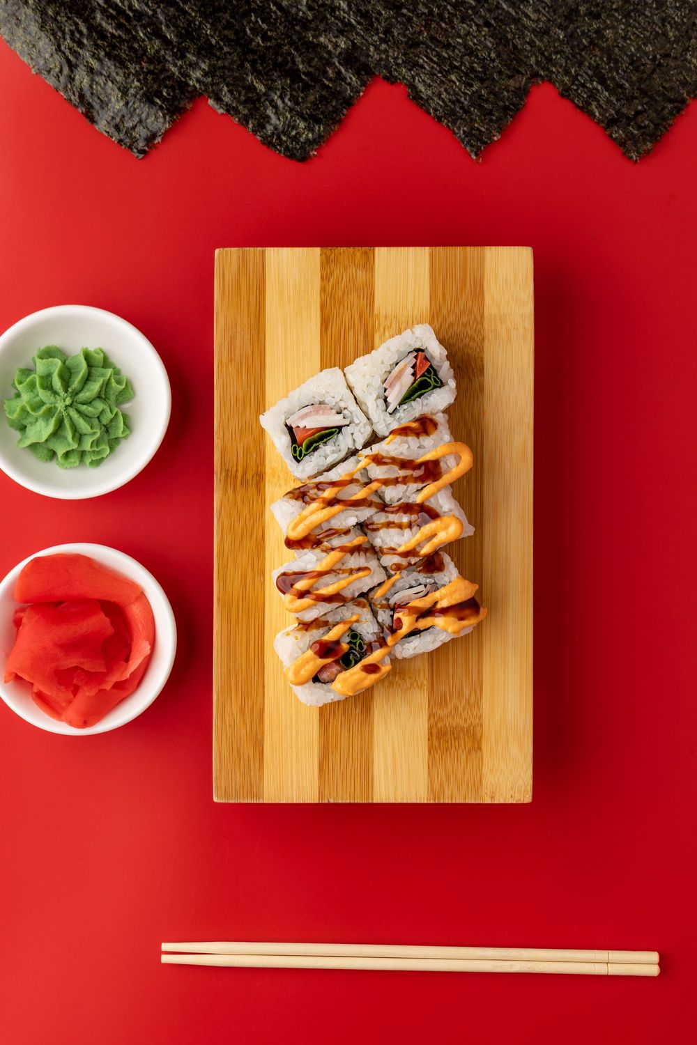 Бекон, помидор, лук зеленый, соус Унаги, соус Спайс (острый).