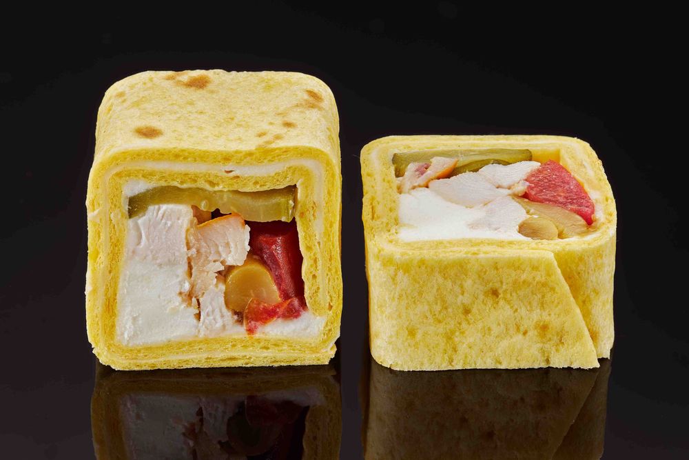 Мексиканская лепешка, сыр творожный, филе копченого цыпленка, свежий помидор, огурец маринованный, маринованные опята