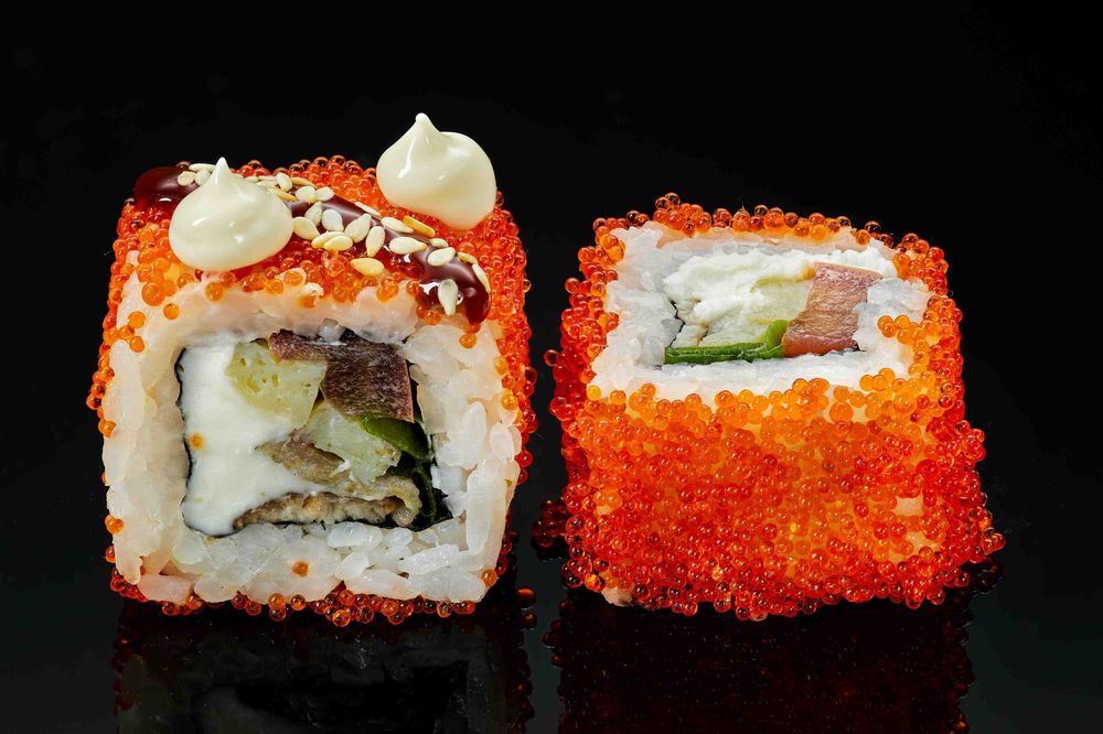 Рис, нори, угорь, томаго, зеленый лук, помидор, сыр творожный, икра тобико, майонез, кунжут, соус Унаги