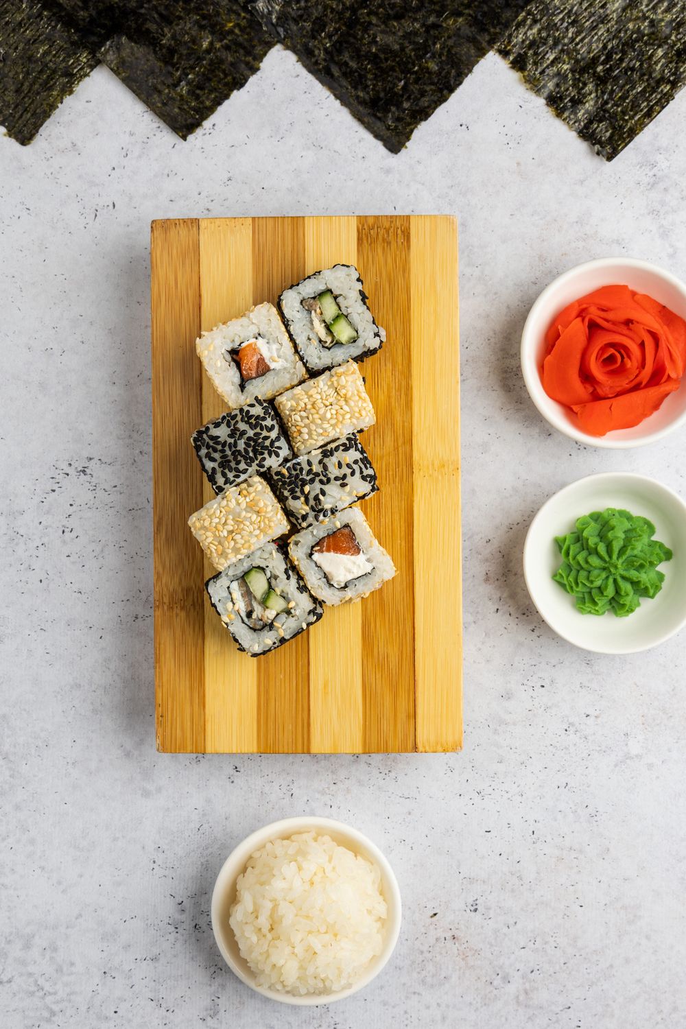 Рис, нори, лосось с/м, угорь, сыр творожный, огурец, кунжут