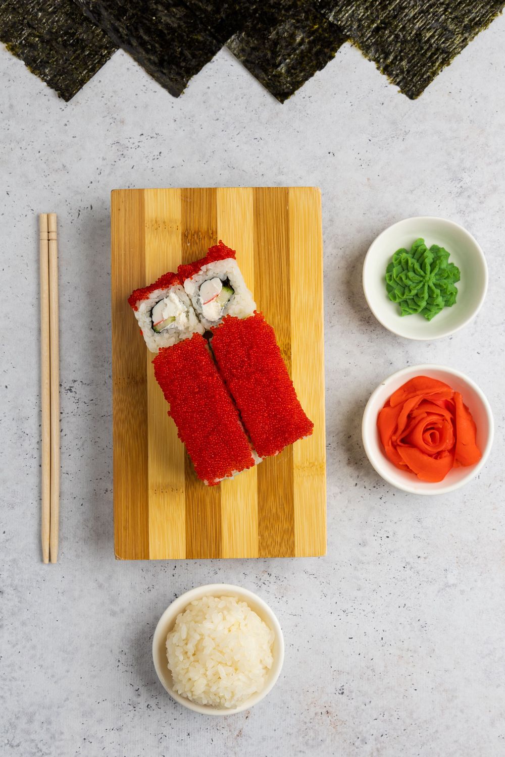 Рис, нори, крабовые палочки, икра тобико, свежий огурец, сыр творожный